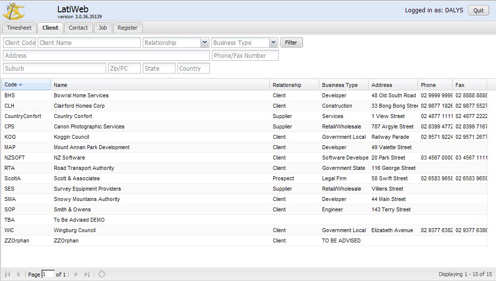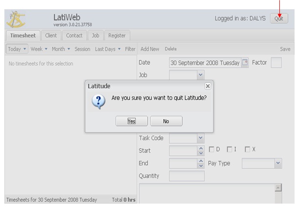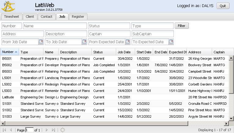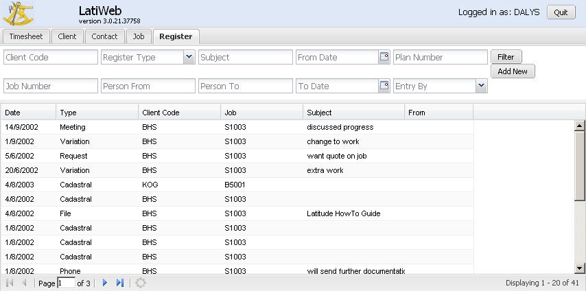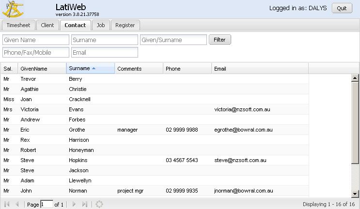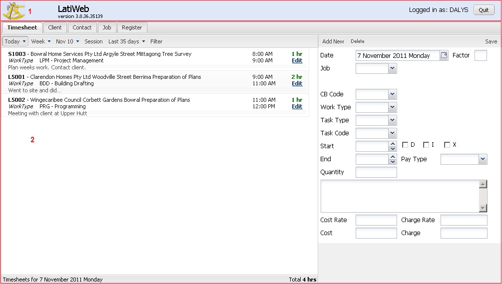 Page Tab Panel - The Page Tab Panel (2) occupies the rest of the Main Application Page. There are 5 Tabs on this Panel, namely: Timesheet, Client, Contact, Job and Register.