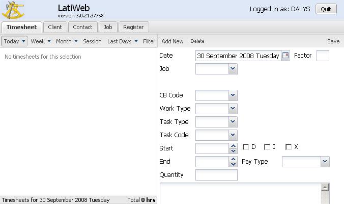 The Timesheet tab allows you to add/edit/delete timesheets. By Default, it shows the current day’s timesheets and the various view options available e.g. Day, Week, Month, Session, Last Days and Filter.