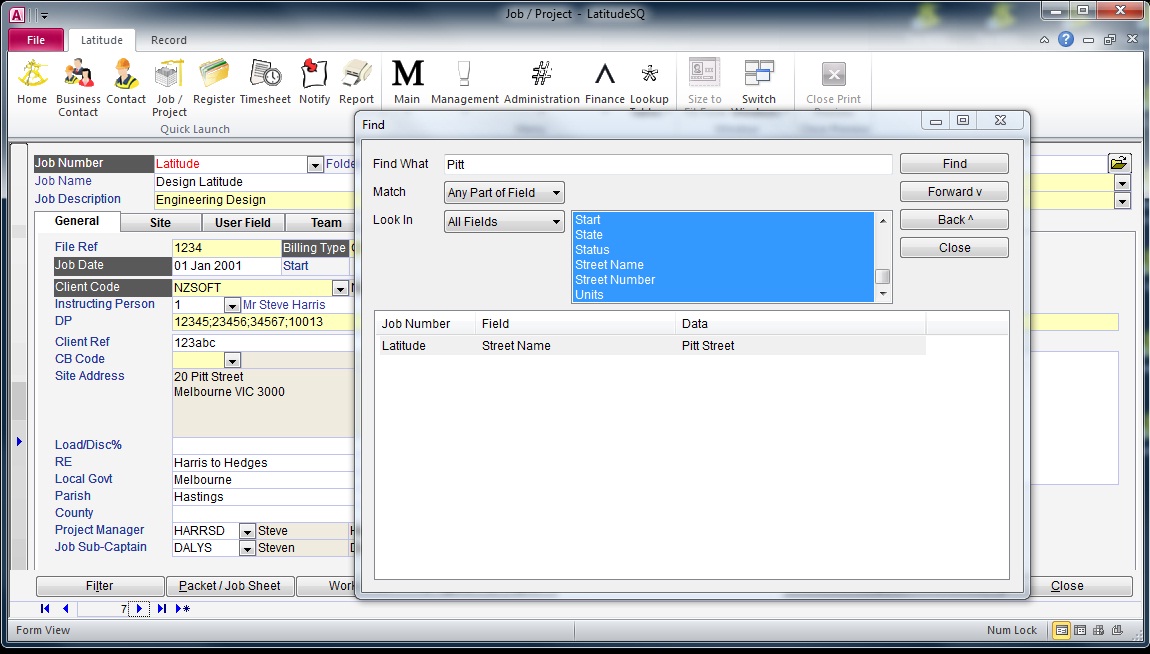 Records can be searched for by looking for information in a specific field. To search for a record click on the field you wish to search by, and press Ctrl+F on your keyboard. This opens the standard Windows dialog box for searches.