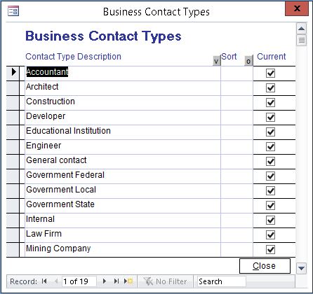14.1.1 From the Home screen, click "Lookup Tables" and click "Client Type" to open the "Business Contact Type" screen.