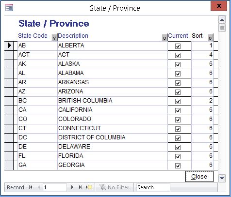 19.1.1 From the Home screen, click "Lookup Tables" and click on the "State/Province" to open the "State/Province" screen.