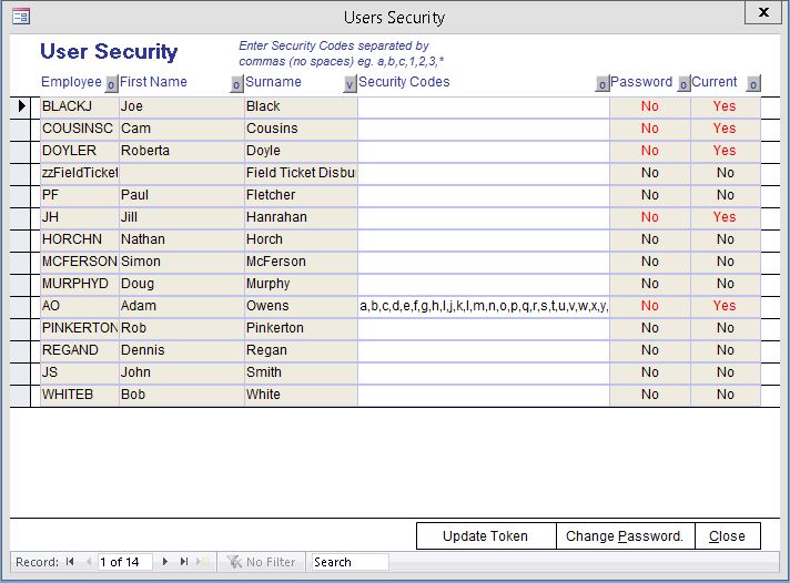 The purpose of the User security form is to facilitate the entry and changing of user (employee) passwords and to allocate security codes (representing security groups) to each user.