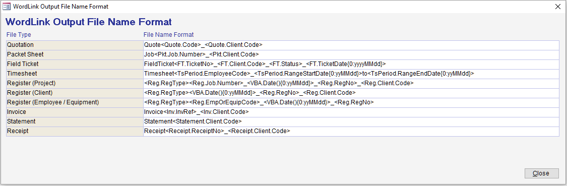25.4.1 Customize document file names on your quotation, job packet sheet, field ticket, timesheet, invoice, receipt, register document or statement generated from Latitude. This allows you to define your own file naming structure on each of the above documents.