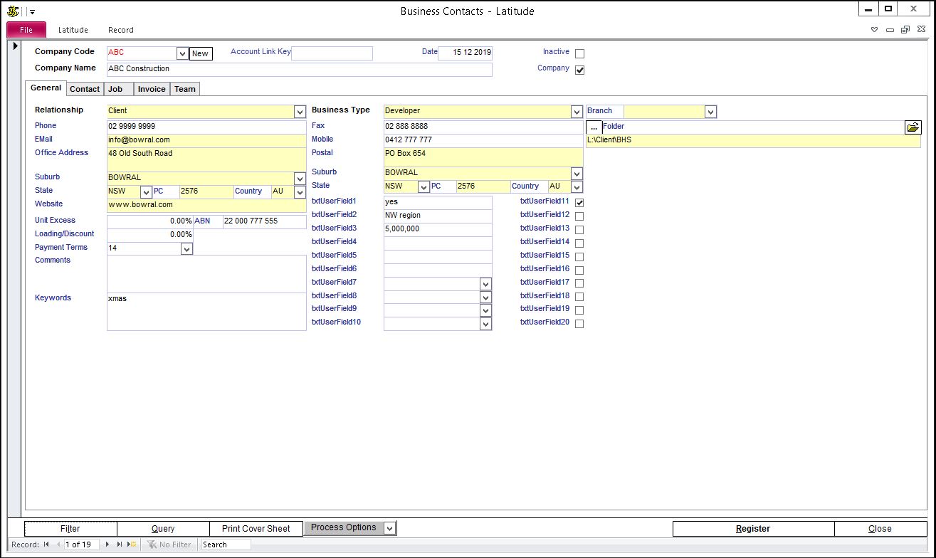 28.1.1 The Business Contact screen is used to keep track of all your business contacts including clients, suppliers & general contacts.