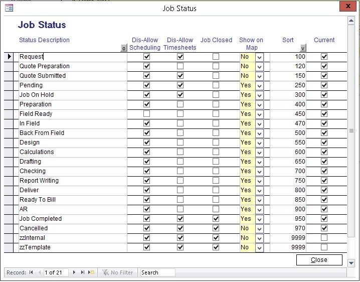 All Jobs on a map display their job number, job type, date & client. It also includes any surrounding jobs. You can set to show only the current Job info on a map (Setup -> Job/Task/Emp -> Show only current Job Info in Map).