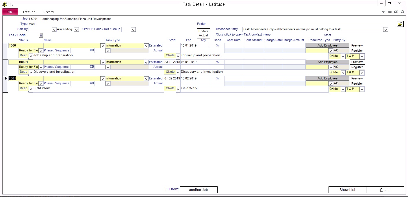 35.3.1 The Task screen displays the Task List by default unless the 'Show Task Detail screen first' is selected in Administration -> Setup -> Job/Task/Emp.