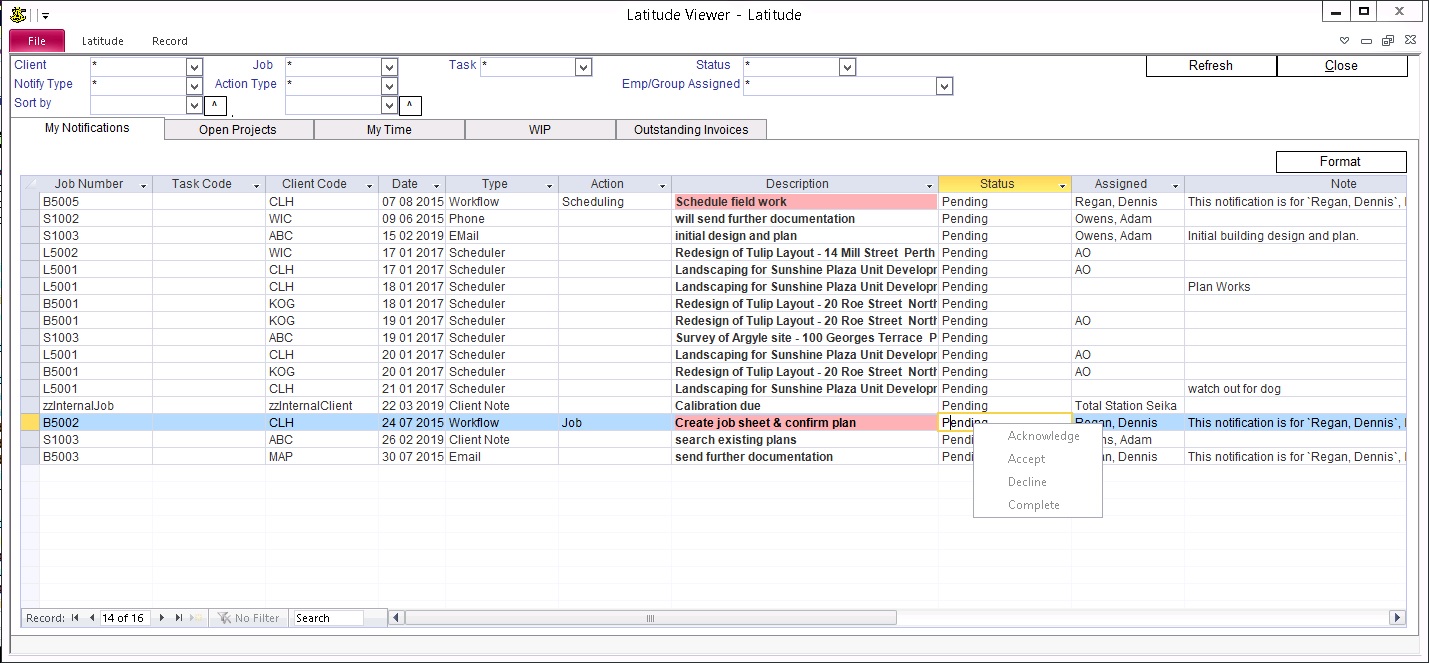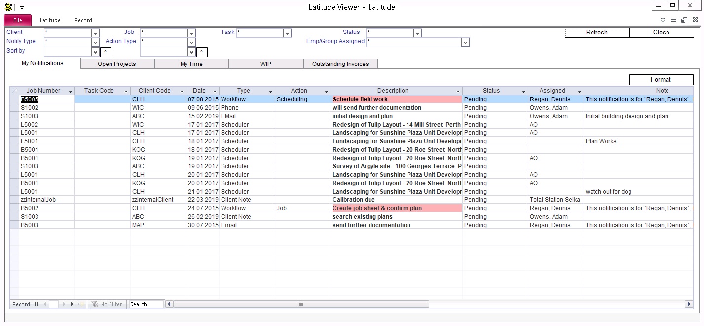 My Notifications Latitude View works with the register items, equipment items, employee reminders and workflow items to inform the currently logged in user when an item needs to be attended, eg. item is due or a next step is required. The "Latitude Viewer" screen automatically appears when an employee with outstanding items logs in. This screen can also be viewed by going to "Ribbon" -> click "Latitude Viewer". By default, items are sorted starting with the oldest due to the most recent.
