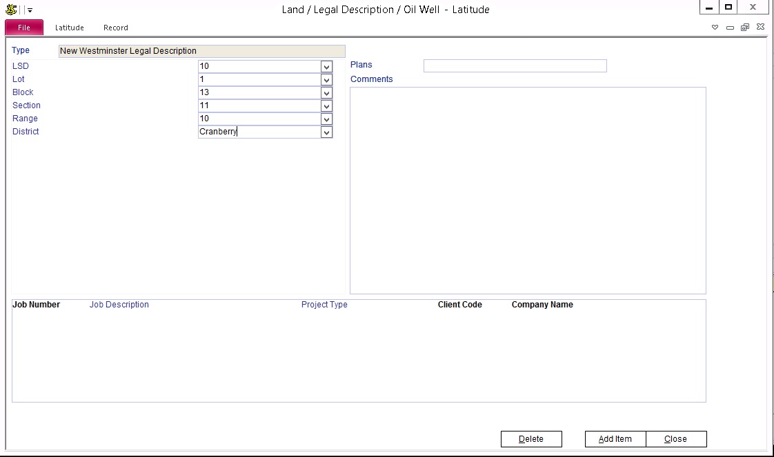 From the Home screen, click "Main" and click "Business Contact". Select the Client and then click on the Jobs tab. Double click on the Job in the list of jobs to open the "Job/Project" screen. Click on the "Site" tab and then click on the "Add Land / Legal Description" button.