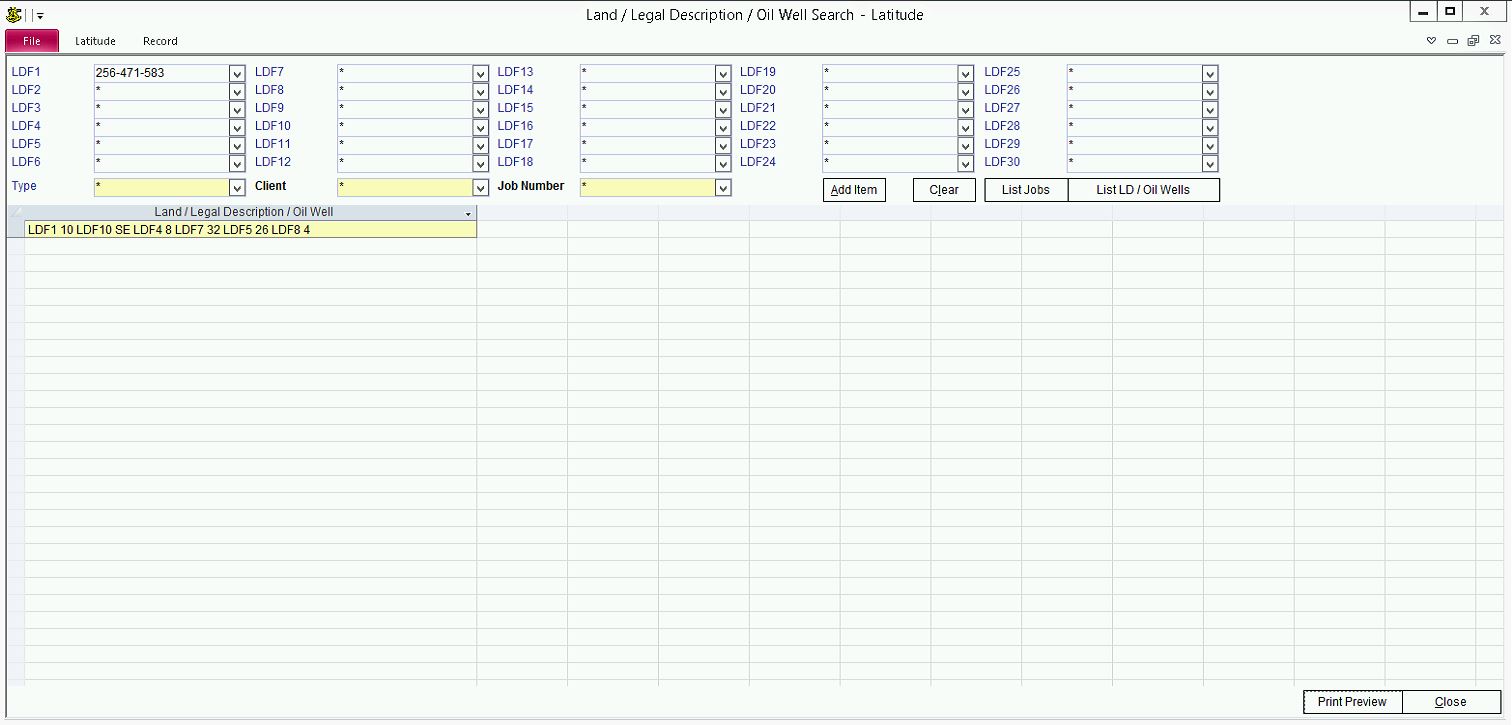 To view Land/Legal Descriptions that are not linked to any job -> select [none] in the Job Number Dropdown -> Click List Jobs