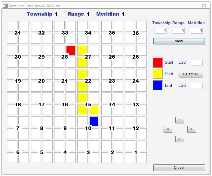 39.8.1 This is a sample grid view of the legal descriptions on a site using the Dominion Land Survey grid system. It allows you to visualize where your legal descriptions are located and connected.