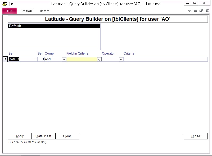 42.3.3 In the "Set" column, enter a query name. If you do not enter any value, it will use 'Default' as its query name. If you place a name, you can re-use the query next time by selecting the name from the list box at the top of the screen. If the query is composed of multiple fields then make sure each field has the same query name.
