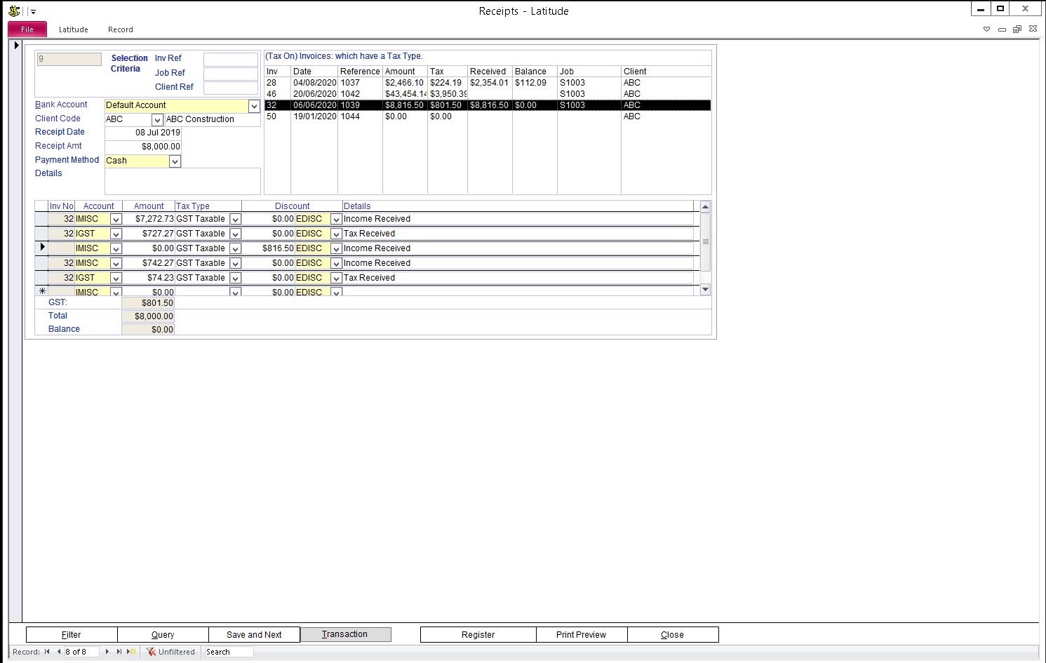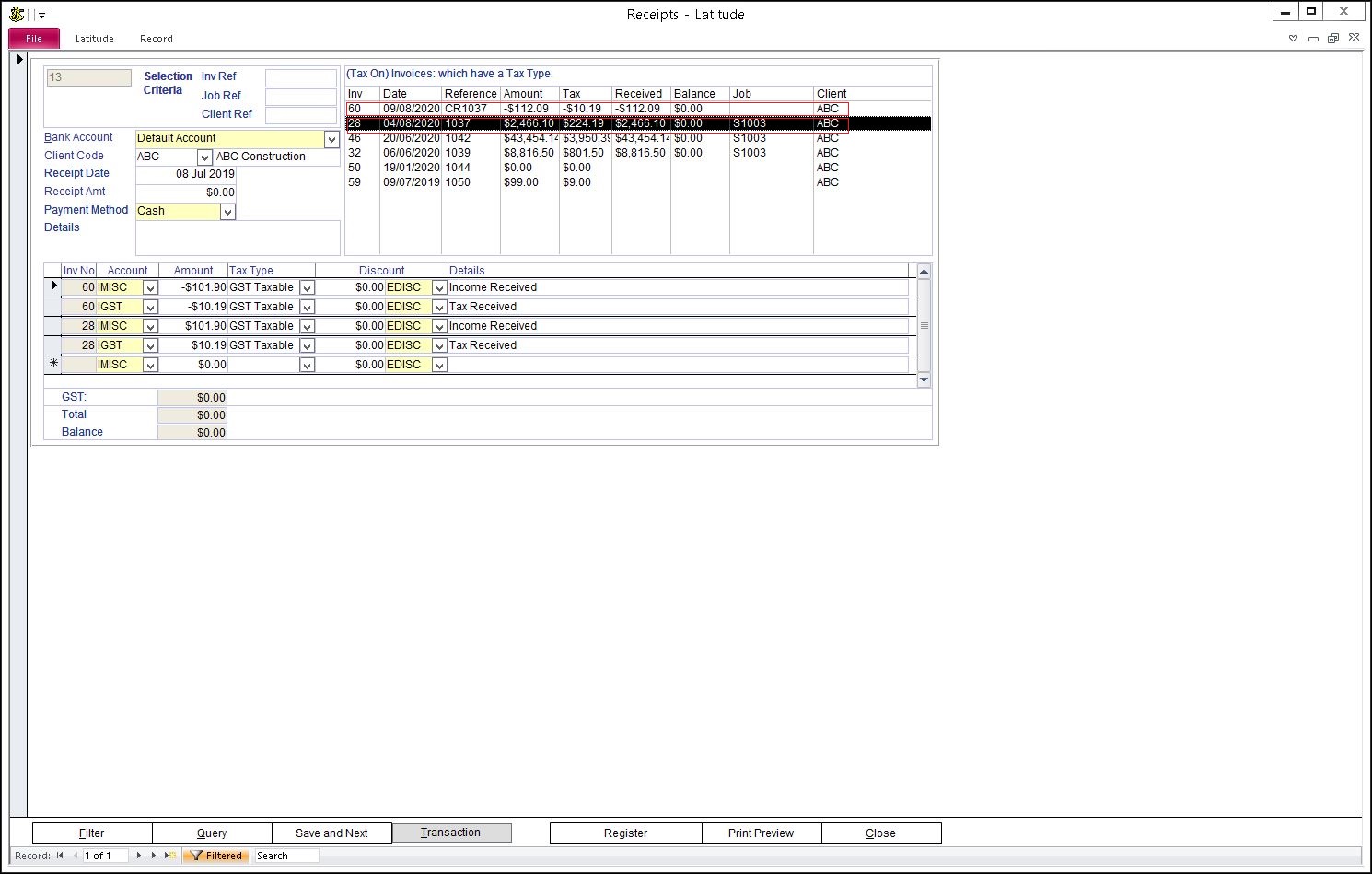 Select a Bank Account, Client Code, Enter Receipt Date, Payment Method and Details