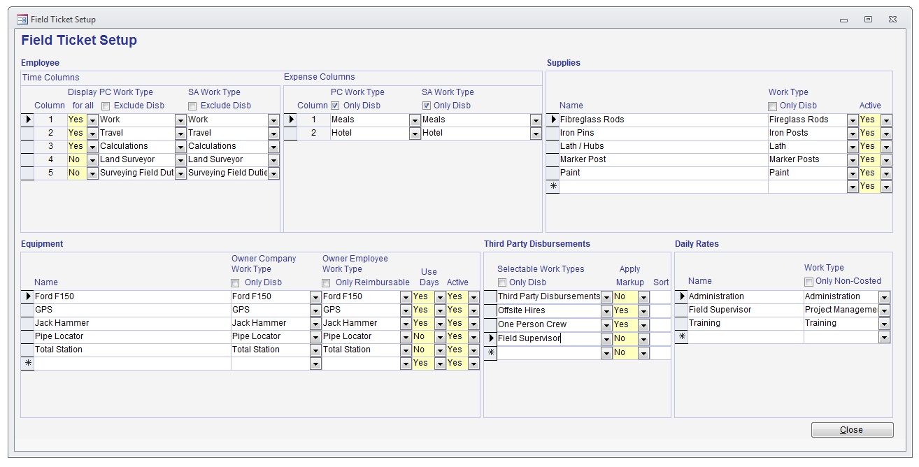 This screen is used for defining what work types will be used for the Timesheets and Standard Expenses generated by field tickets, the Equipment and Supply Items that usage can be recorded for, and what Daily Rate work types can be used.