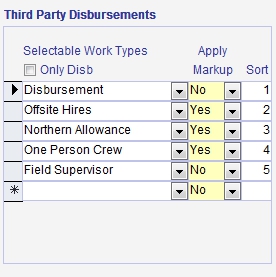 Third Party Disbursements are used for any non-standard expenses, for example the hiring of equipment. The details and amount for the expense can be entered in the field ticket. Enter all the disbursement work types that you may need in field tickets.