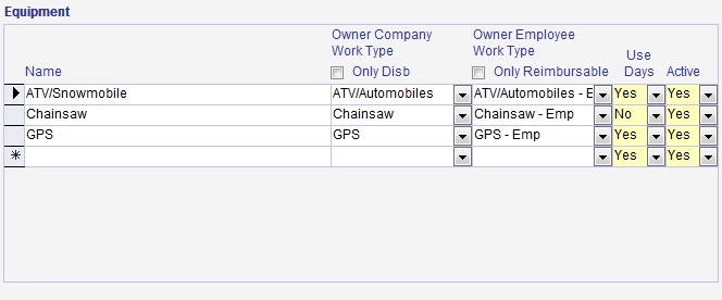 NOTE: Leaving the Work Type empty will mean that a Disbursement will not be generated for usage entered for the equipment type, but the data will still be recorded in the Field Ticket.