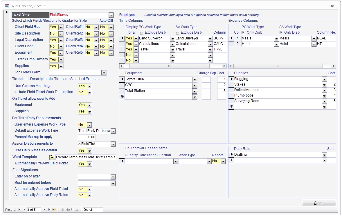 Override Field Ticket Crew Time & Expense Work Types on each Style. Useful for companies that have several types of crews working on the same job. This overrides the "Display for All" flag, crew chief & survey assistant work types and column headings