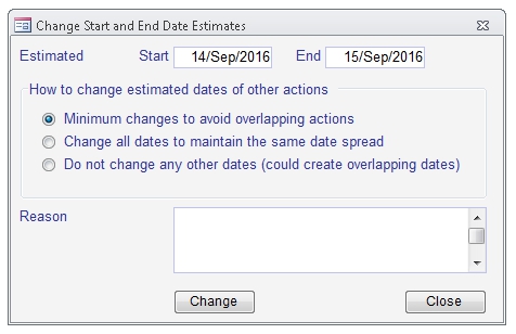 A popup dialog that allows changes to the start & end date estimates with options on how it affects the estimated dates of other actions.