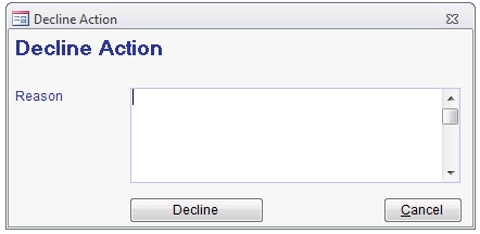 Decline - Prompts a box to enter the reason and sets the action status to "Declined" and then notifies the step's responsible person. When an action is assigned to a group, the notification only notifies the step's responsible person after all members of the group have declined the action. The responsible person can see all the members reasons for declining an action in the action screen.